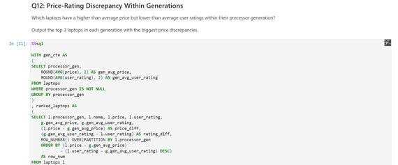 SMARTPRIX LAPTOP MARKET ANALYSISDeveloped end-to-end data analysis pipeline using PostgreSQL and Python to clean and analyze 1,000+ laptops from SmartPrix. Leveraged SQL for data cleaning and complex queries, revealing key market trends and price-performance insights that could inform purchasing decisions and competitive analysis.
