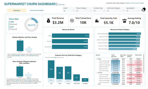 SUPERMARKET CUSTOMER CHURN ANALYSISThis project analyzes customer churn for a supermarket chain. Using Power BI, I've created a comprehensive dashboard to visualize and understand factors influencing customer retention and churn. Uncovered key insights like how age and credit card ownership impact churn and how different branches perform.
