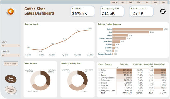 COFFEE SHOP SALES ANALYSIS AND PERFROMANCE OPTIMIZATIONAnalyzing sales trends and store performance data for Maven Roasters, I constructed an extensive data model, uncovered sales trend, identified top-selling products, peak sales hours, and store-specific insights. Leveraging Power BI, this interactive dashboard offer actionable insights to optimize sales, capitalize on high-demand products, and drive revenue growth.